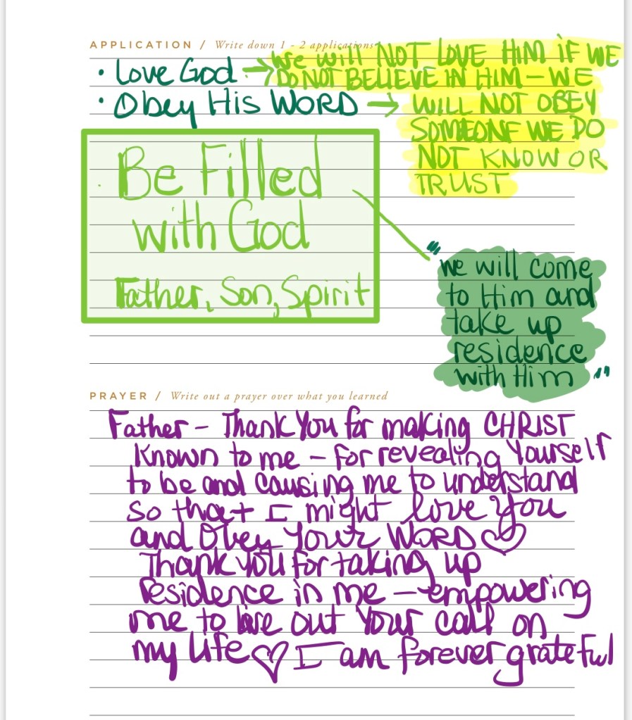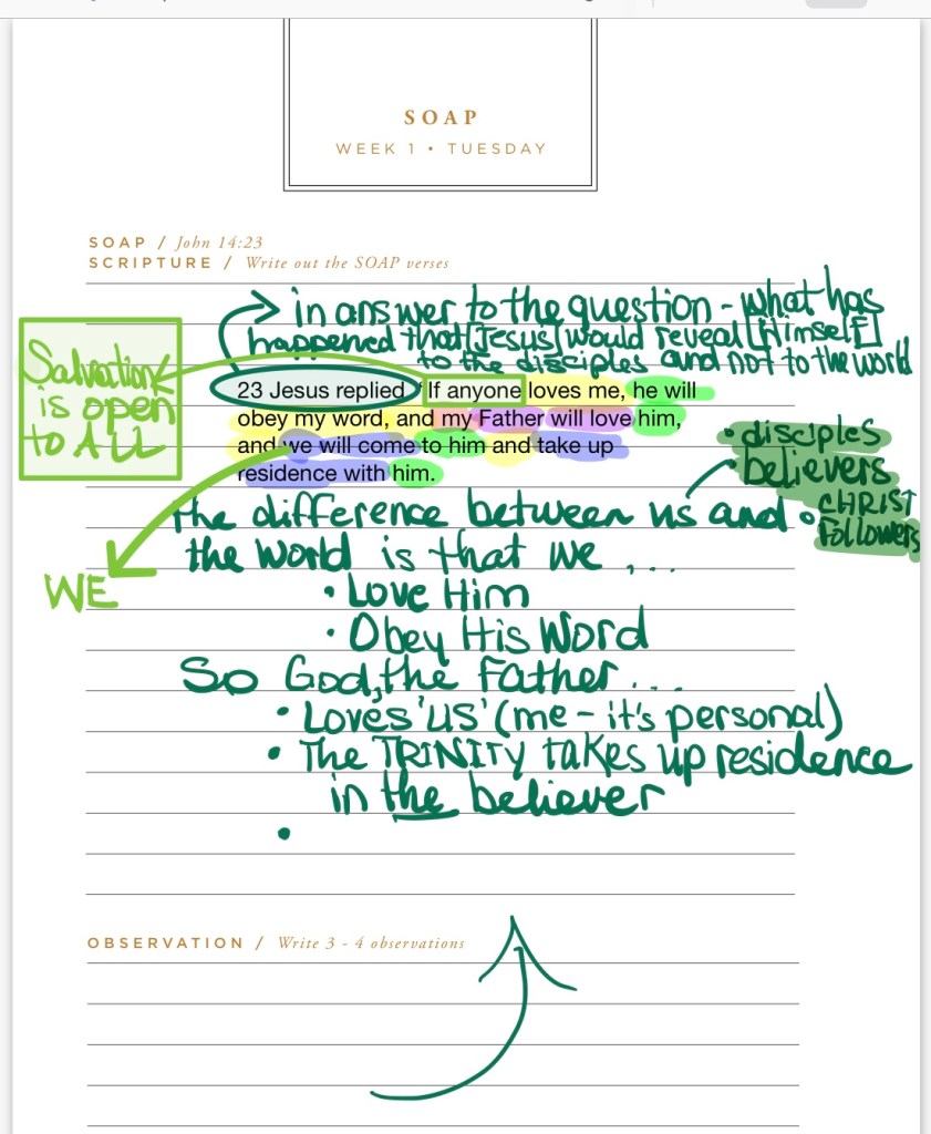 Posted in Uncategorized Evidence of Our Faith Posted on May 1, 2023May 1, 2023 by Sometimes the journal simply says it better than the words I can write. Scripture Reading: John 14:15-23; SOAP / John 14:23 Notes / observations The Application and Response to God’s Word Share this: Share on X (Opens in new window) X Share on Facebook (Opens in new window) Facebook Email a link to a friend (Opens in new window) Email Print (Opens in new window) Print Share on Pinterest (Opens in new window) Pinterest Like Loading... Related Author: View All Posts