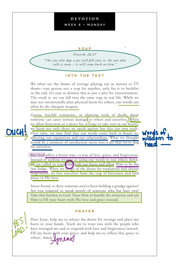 It never gets old seeing God so visibly at work and/or seeing His Word played out in our own lives or on the pages of Scripture. What perfect correlation is seen in Haman hanging on the gallows he had built to hang Mordecai from, and the words of today’s Proverb: If you set a trap for others, you will get caught in it yourself. If you roll a boulder down on others, it will crush you instead.