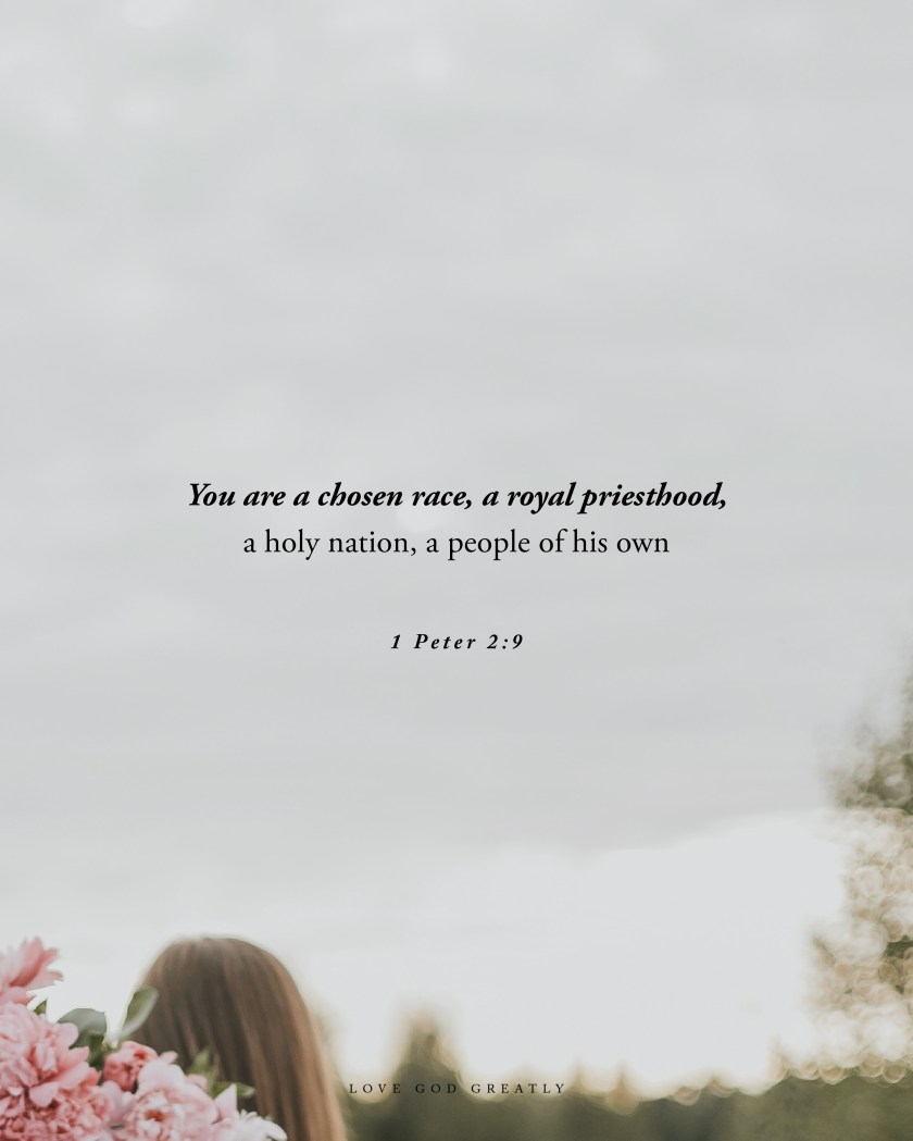 The main focus of today’s journey is Peter’s description of God’s chosen people. The description can be both exciting and confusing, because, as Bibleref.com points out, “the language Peter uses has been used to describe God’s special relationship with Israel.” (Exodus 19:6) However, as the commentary goes on to explain, “As Israel was, we~believers, the church — are also a chosen race…though not in the sense of our family, ethnicity, skin color, or country of origin.” Instead, “We are a spiritual race, in the sense that, in Christ, we share a single spiritual Father. In that same meaning, we are a ‘holy nation,’ a specific group of people called out and set apart from all other nations.” Friends, I don’t know about you, but that gets me all kinds of excited, thankful, and proud to be called a child of God!