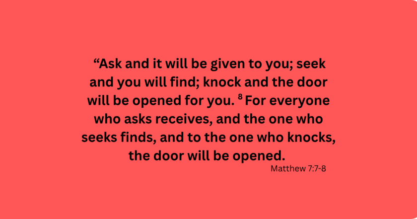 “Ask and it will be given to you; seek and you will find; knock and the door will be opened for you. For everyone who asks receives, and the one who seeks finds, and to the one who knocks, the door will be opened. Matthew 7:7-8