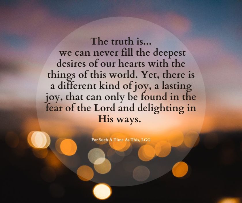 The truth is, we can never fill the deepest desires of our hearts with the things of this world. Yet, there is a different kind of joy, a lasting joy, that can only be found in the fear of the Lord and delighting in His ways.