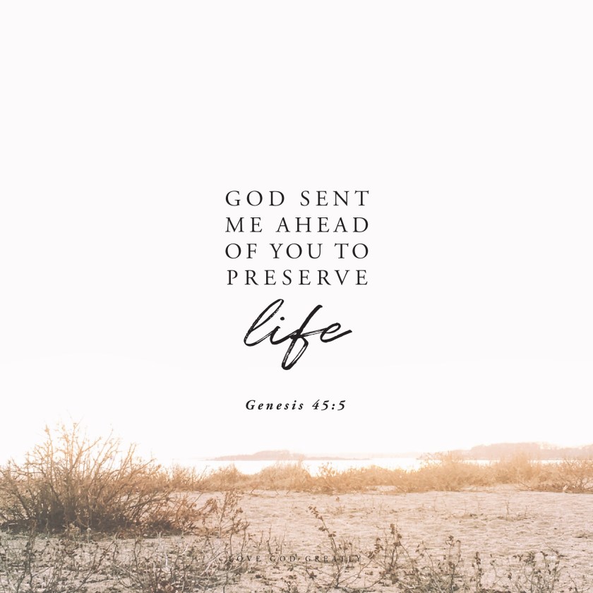 But don’t be upset, and don’t be angry with yourselves for selling me to this place. It was God who sent me here ahead of you to preserve your lives.  Genesis 45:5  NLT