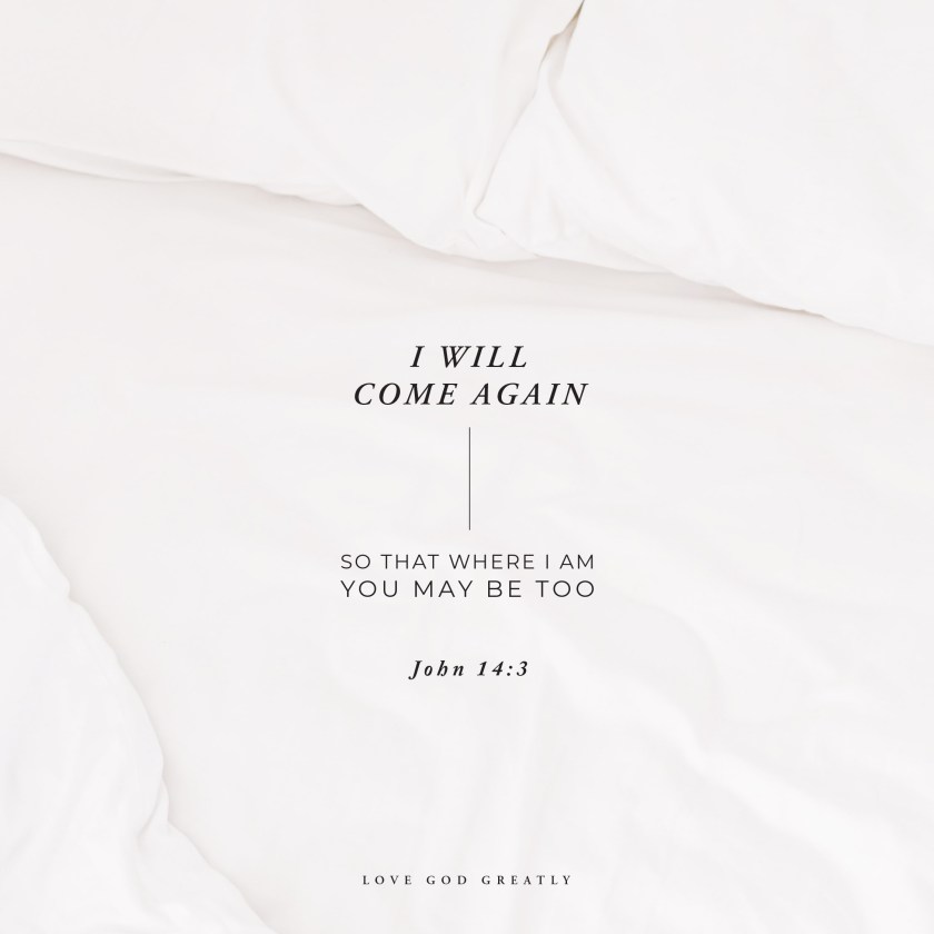 “Do not let your hearts be distressed. You believe in God; believe also in me. 2 There are many dwelling places in my Father’s house. Otherwise, I would have told you, because I am going away to make ready a place for you. 3 And if I go and make ready a place for you, I will come again and take you to be with me, so that where I am you may be too. John 14:1-3NLT