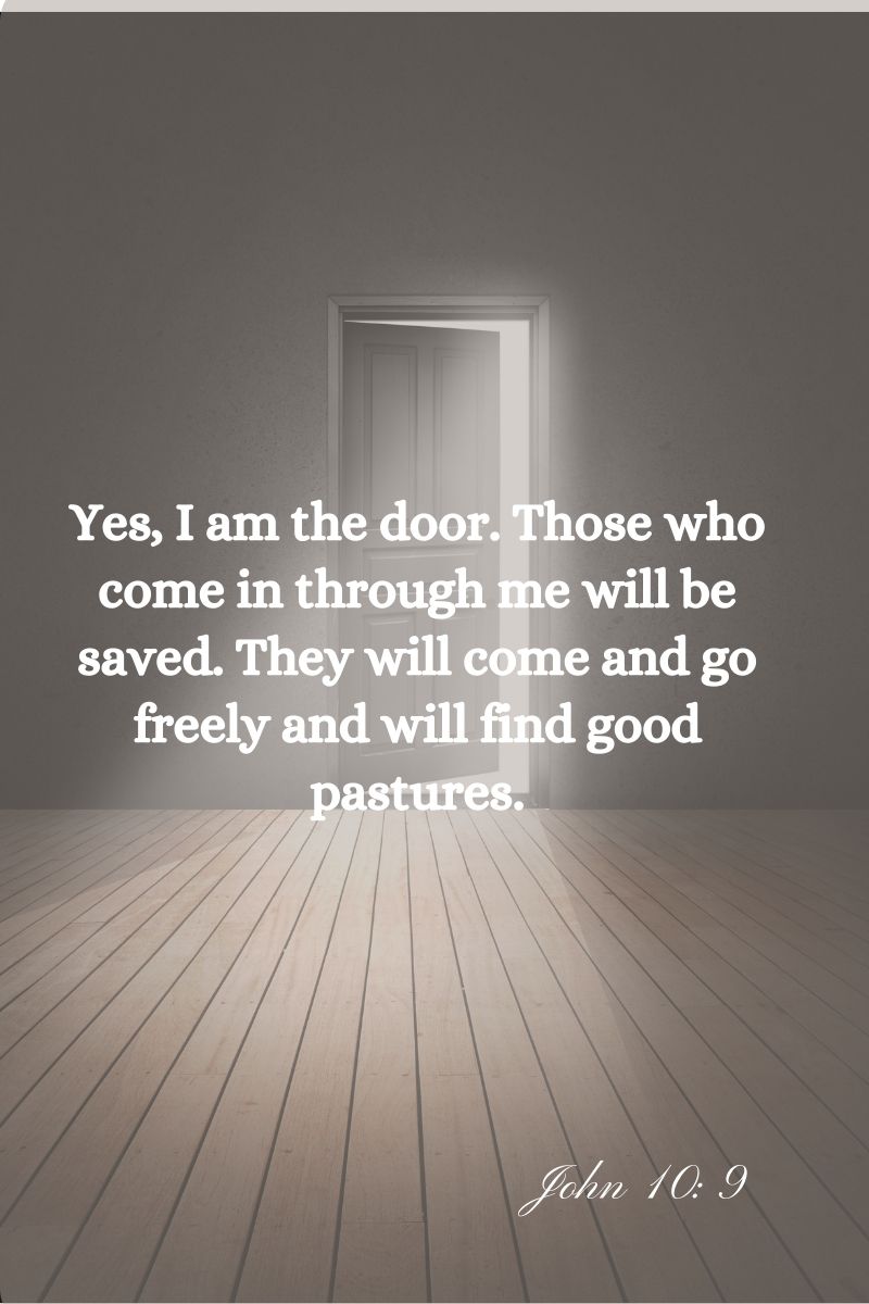 Yes, I am the door. Those who come in through me will be saved. They will come and go freely and will find good pastures.