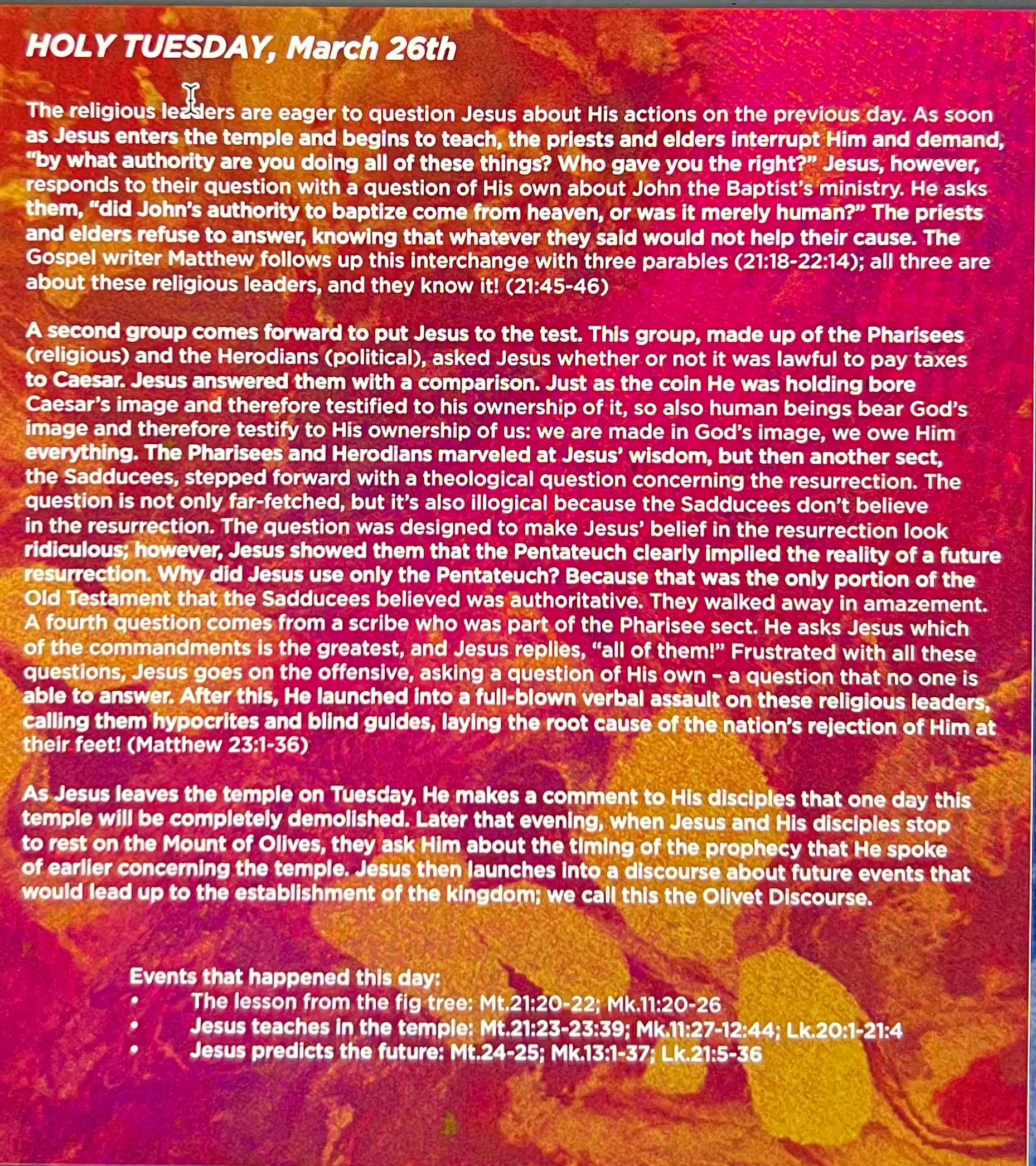 There is much to be learned from the Pharisees and Chief Priests remembering the words of Jesus – namely that we should do the same. As was noted in the Love God Greatly devotional, they knew and understood the power of His impact. Because of this, they sought to do something about them.