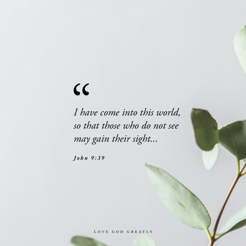 Sometime after Jesus had escaped the murderous plot of those who were hostile to Him in John chapter eight, “He saw a man who was blind from birth”. His disciples were curious and asked who was to blame for the man’s blindness – him or his parents. Jesus’ answer may surprise you. He said, “It wasn’t sin that caused the man’s blindness.” Jesus laid the answer at God’s feet when He replied that it happened – “so that the acts of God would be seen through him”. Even if you’re familiar with the story, I believe most would admit that the answer Jesus gave was not what anyone expected. It’s important to note this part of the chapter and all that happens after it to truly understand what Jesus meant both throughout the chapter and in today’s focus verse.