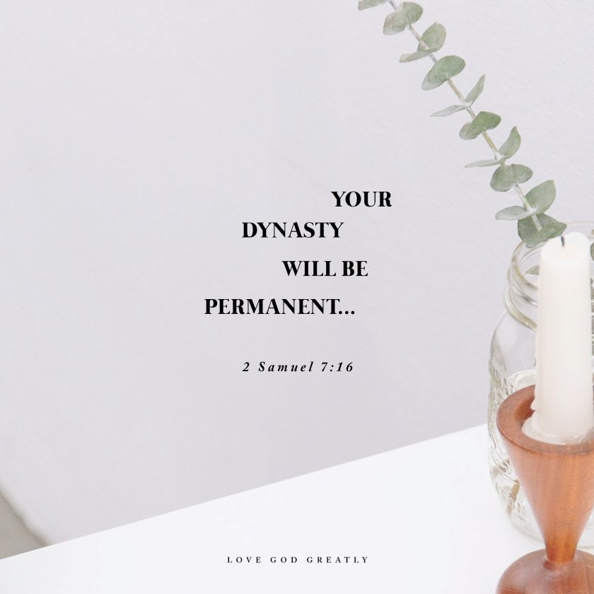 “‘Furthermore, the Lord declares that he will make a house for you—a dynasty of kings! 12 For when you die and are buried with your ancestors, I will raise up one of your descendants, your own offspring, and I will make his kingdom strong. 13 He is the one who will build a house—a temple—for my name. And I will secure his royal throne forever. 14 I will be his father, and he will be my son. If he sins, I will correct and discipline him with the rod, like any father would do. 15 But my favor will not be taken from him as I took it from Saul, whom I removed from your sight. 16 Your house and your kingdom will continue before me[b] for all time, and your throne will be secure forever.’”