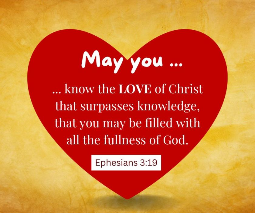 My Prayer for You For this reason I bow my knees before the Father, 15 from whom every family in heaven and on earth is named, 16 that according to the riches of his glory he may grant you to be strengthened with power through his Spirit in your inner being, 17 so that Christ may dwell in your hearts through faith—that you, being rooted and grounded in love, 18 may have strength to comprehend with all the saints what is the breadth and length and height and depth, 19 and to know the love of Christ that surpasses knowledge, that you may be filled with all the fullness of God.