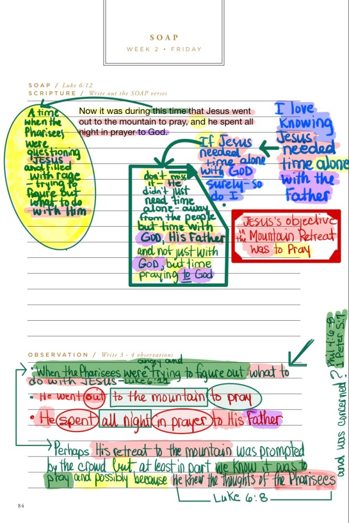 I hope you enjoy this bit of a different view today – straight from inside the pages of my journal, the heart (my heart) of the study. Whether you journal on the pages of your Bibles, or in a notebook, or an LGG Journal, or on post-it-notes it doesn’t matter. I believe what matters is that you journal. One word or 50 – more or less … the amount isn’t the point the journaling is. It’s a place to capture your thoughts or questions or even the title of a song that came to mind. When you look back in your journal it will tell a story of what God was teaching you and so much more. In the weeks ahead my goal is to share more of these pages and give some pointers on journaling for those who are interested.