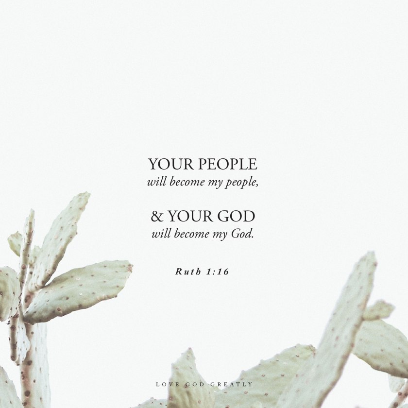 Don’t ask me to leave you and turn back. Where ever you go, I will go; and where ever you live, I will live. Your people will be my people, and your God will be my God.2