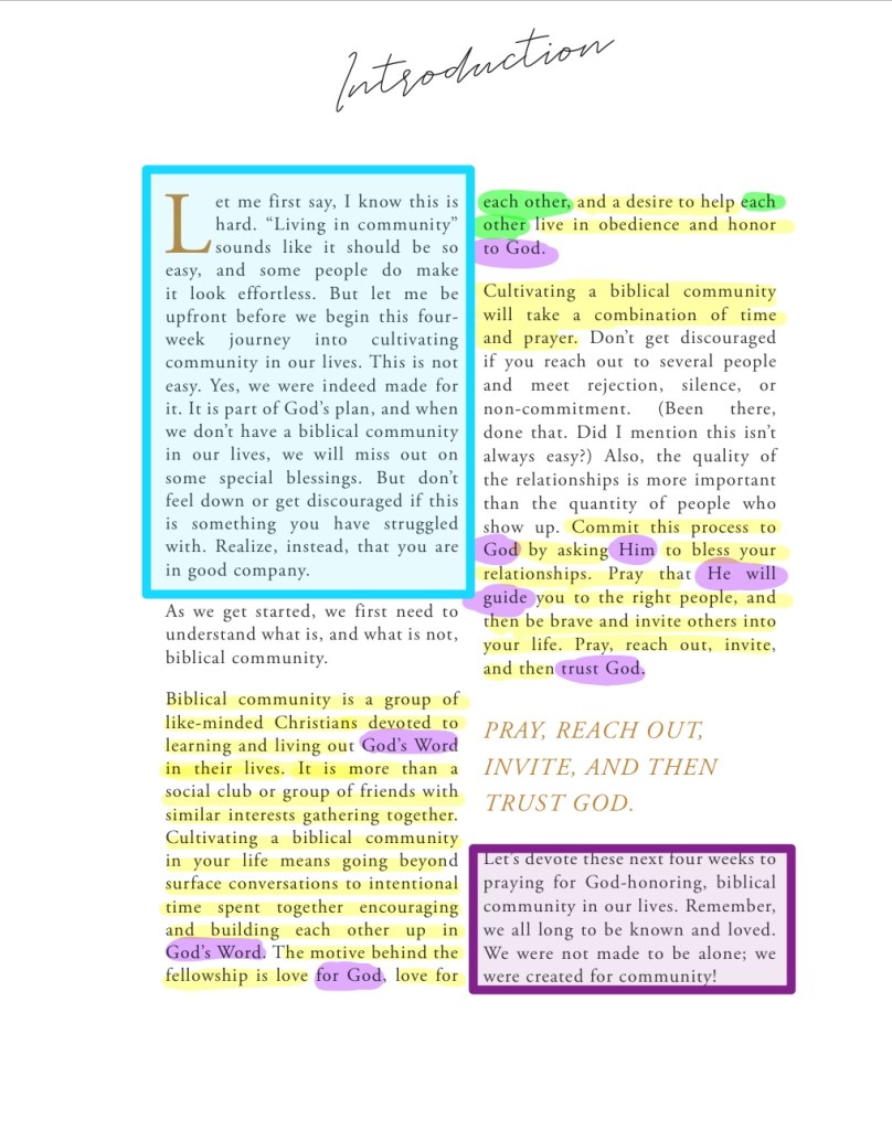 This introduction is not my own. I borrowed it from the Love God Greatly Journal, and I’m guessing some version of it has been on their blog page, so you may have already seen it. However, if I was going to write an introduction meant just for our little group, one that would encourage each participant to be committed to and participate in this little community – I couldn’t have written it better than this. When I started this group two or three years ago it was in part out of concern for those who couldn’t get out or didn’t have a group to be a part of. Years ago God called me to equip, encourage, and empower women with His Word and I have been trying to do just that since the day He called me. However, because of family responsibilities, health issues of my own, and the whole covid shut-down I was struggling with the commitment of the two in-person groups I led,. So this group became a God directed outlet of hope to help others to stay or be strengthened in their faith by spending time in God’s Word, both personally and also with an online group of women hungry for the same thing. My hope and prayer continues to be that our little community will develop into one where we share/discuss what we are learning or simply a favorite part of the day’s passage, and even praises and prayer requests. To quote the opening and closing words of the following introduction, “- I know this is hard. … but [ladies] we were not made to be alone; we were created for community.”