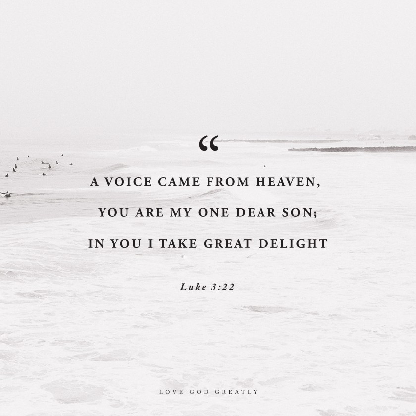 Now when all the people were baptized, Jesus also was baptized. And while he was praying, the heavens opened, 22 and the Holy Spirit descended on him in bodily form like a dove. And a voice came from heaven, “You are my one dear Son; in you I take great delight.”